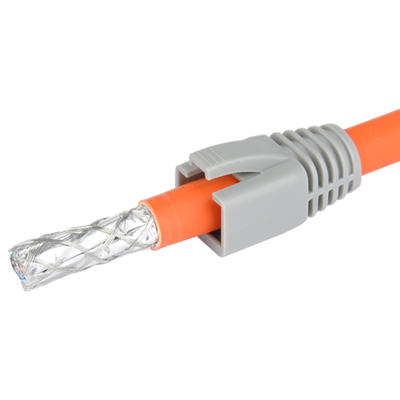 Im Lieferumfang enthalten sind das Steckergehäuse, eine Einführhilfe für die Sortierung der Adern sowie eine graue Tülle mit Knickschutz. Der RJ45 Stecker lässt sich auf alle Netzwerkkabel mit starrem Innenleiter bis max. AWG23 (Ø 0,57 mm) und einem Außendurchmesser von Ø max. 7,5 mm montieren.